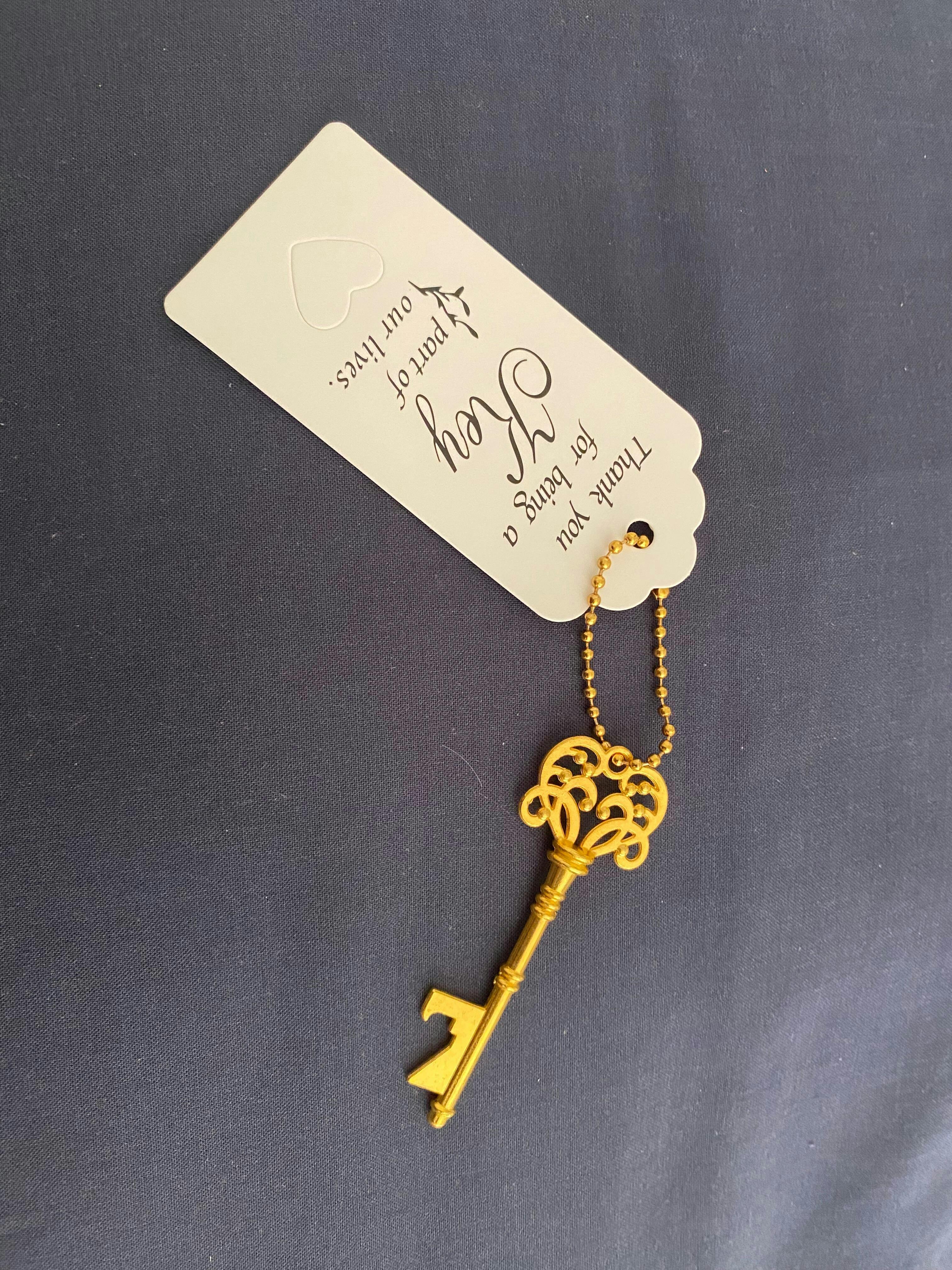 For the Bride-to-be seeking a heartfelt and unforgettable way to thank her guests, these charming Key Bottle Openers are the perfect choice! Ideal for wedding favors, bridal shower gifts, Bridesmaid Proposal Gifts, or showing appreciation to your bridal party, these key-shaped openers are both functional and stylish. Designed to leave a lasting impression, they add a touch of whimsy to any celebration. Placed elegantly on your tables, they will catch the light and add a beautiful, unique detail to your decor. Your guests will cherish them for years to come, as each time they use this bottle opener, it will remind them of your special day. Cheers to love, laughter, and creating lasting memories!